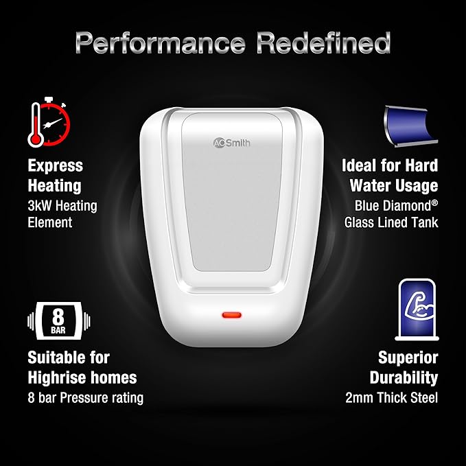 - SLEEK DESIGN FOR YOUR KITCHEN AND BATHROOM: Elevate your space with the AO Smith geyser 3 litre. Its sleek and modern design seamlessly blends into any kitchen or bathroom, making it the perfect kitchen geyser 3 litre for compact spaces and stylish homes.